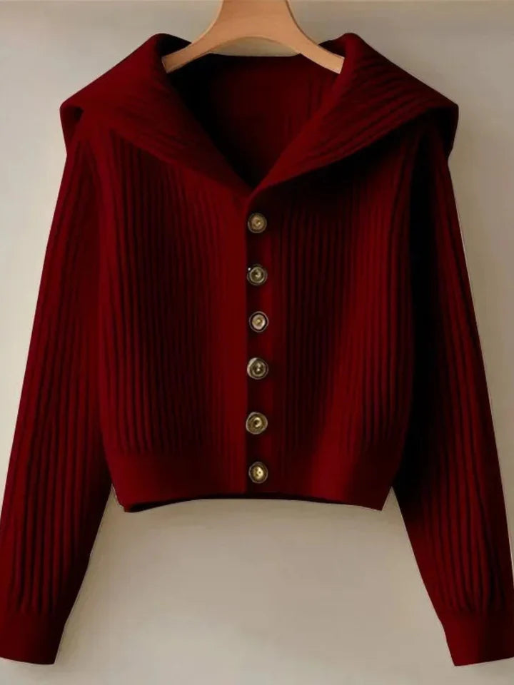 Crafted from a premium stretch-infused ribbed knit, this sweater redefines everyday sophistication with sculptural precision and soft comfort. The statement sailor-style collar adds an architectural edge, while the cropped, contoured silhouette highlights the waist for a flattering, modern fit. Whether worn open or buttoned, it embodies quiet luxury — clean, confident, and timeless.